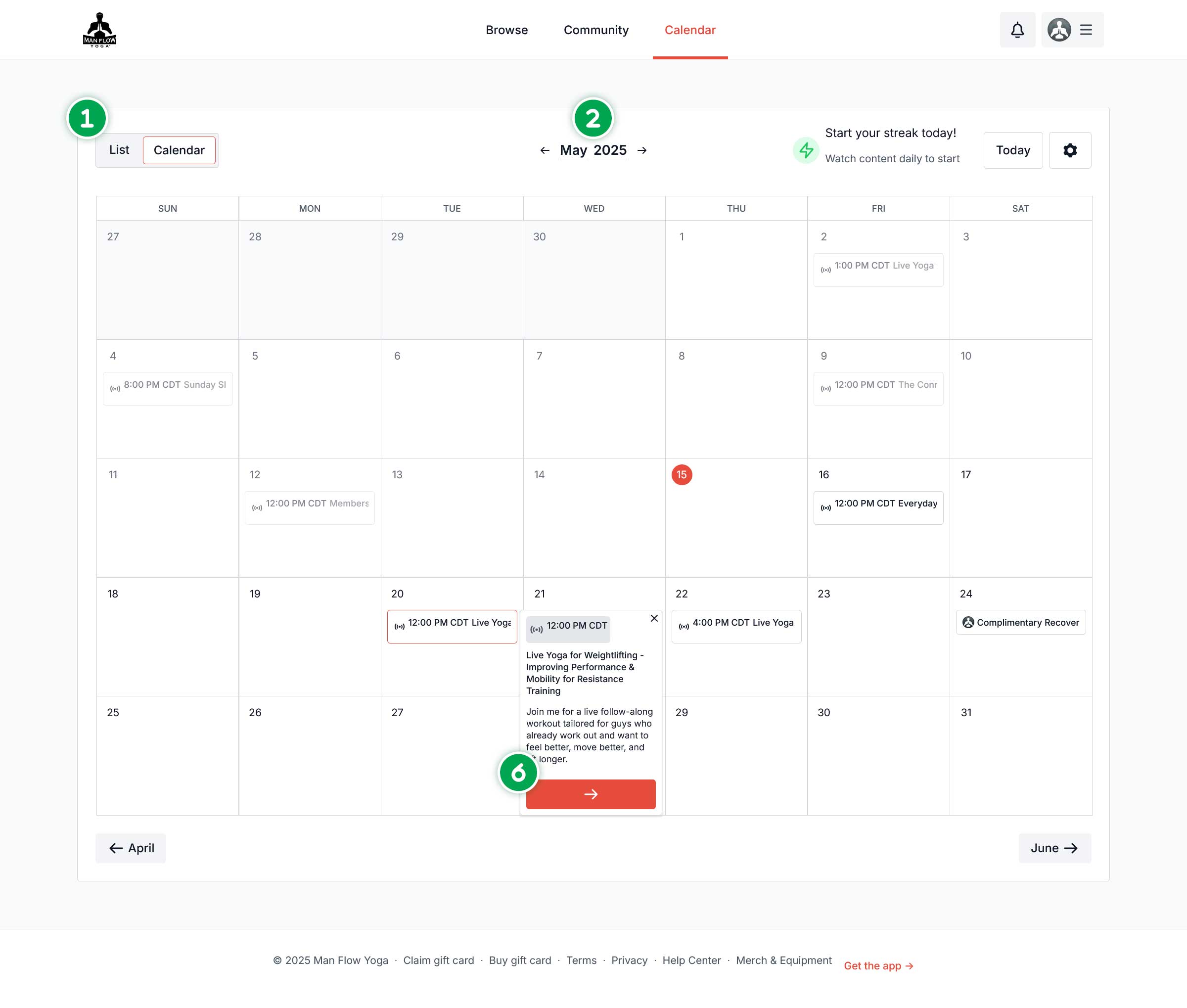 - Calendar: See Upcoming Live events, Schedule your own workouts, View Past Workouts.